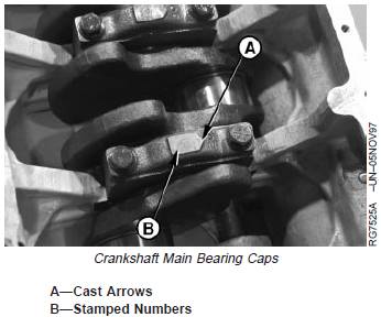 6. Check main bearing caps for arrows (A) cast in mainbearing cap, and numbers (B) stamped on cap and oilpan rail. Arrow points toward camshaft side of engine.If there are no numbers, stamp corresponding numberson cap and oil pan rail to ensure correct placement ofbearing caps during reassembly.