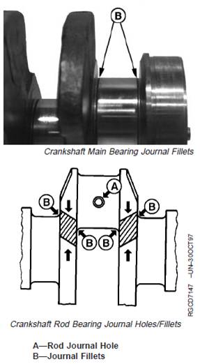 7. Carefully check the crankshaft for cracks in the area ofrod journal holes (A) and at journal fillets (B). Replacecrankshaft if any cracks are found.