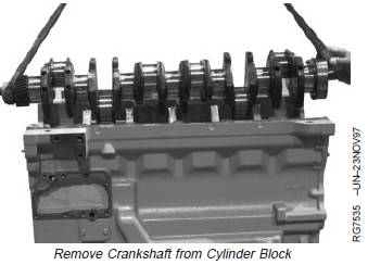 4. Attach a lifting sling to crankshaft. Using proper liftingequipment, carefully raise crankshaft out of cylinderblock.