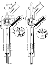 噴油器可以被拆分為一系列功能部件:孔式噴油嘴,液壓伺服系統(tǒng)和電磁閥。燃油來(lái)自于高壓油路,經(jīng)通道流向噴油嘴,同時(shí)經(jīng)節(jié)流孔流向控制腔,控制腔與燃油回路相連,途徑一個(gè)受電磁閥控制其開關(guān)的泄油孔。泄油孔關(guān)閉時(shí),作用于針閥控制活塞的液壓力超過(guò)了它在噴油嘴針閥承壓面的力,結(jié)果,針閥被迫進(jìn)入閥座且將高壓通道與燃燒室隔離,密封。