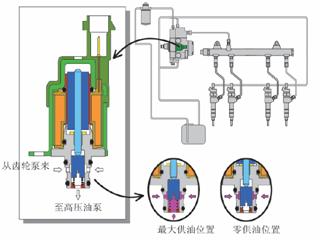 進油計量比例閥安裝在高壓油泵的第一級加壓(齒輪泵)和第二級加壓(柱塞泵)之間,以調整經第一級加壓到第二級加壓的燃油燃油量,而閥的開啟量由ECU控制。其控制方式是ECU通過高脈沖信號中改其占空比的方法,從而進油流量,以增大或減少油量.